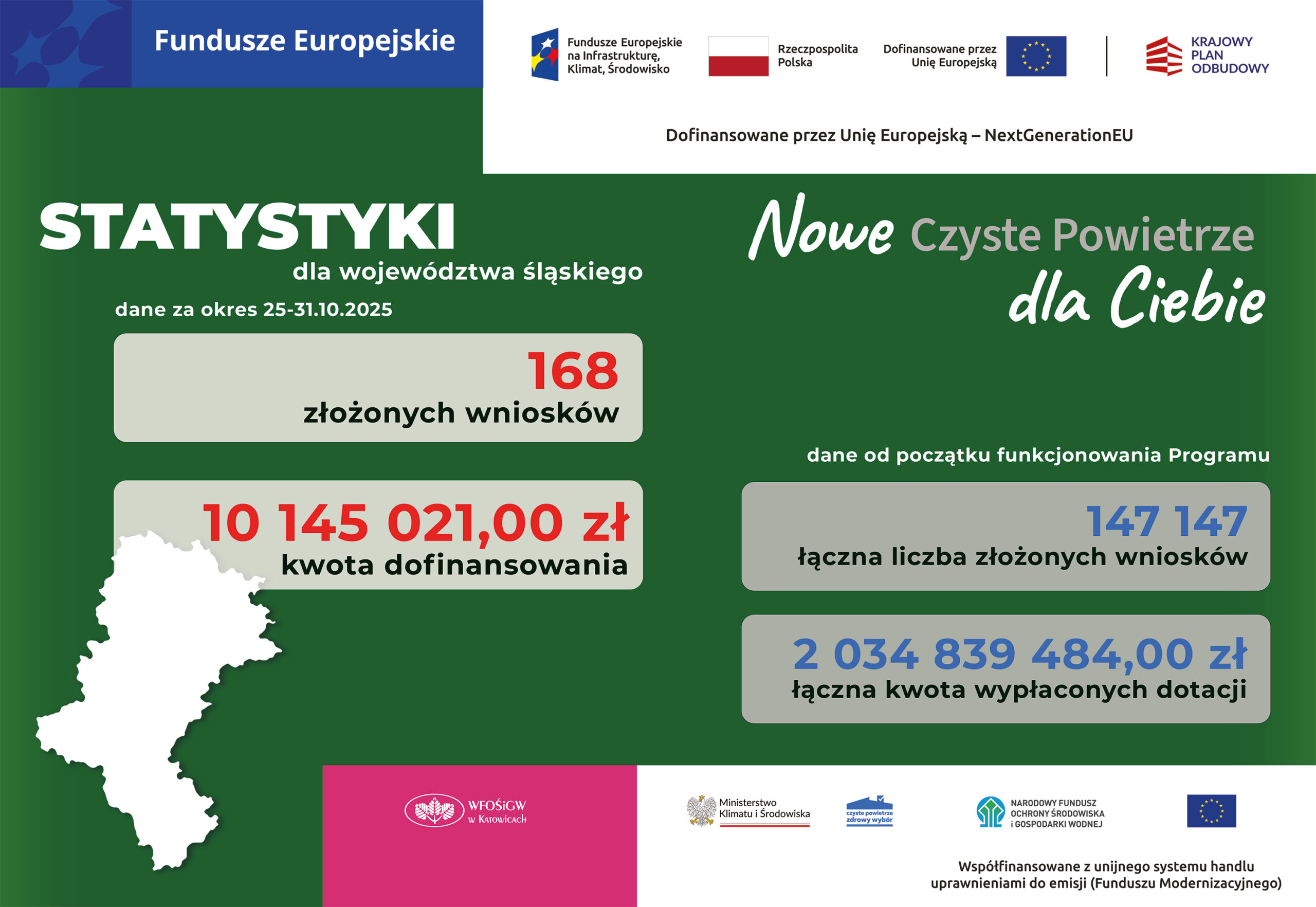 W tygodniu od 25 do 31 października 2025 r. w województwie śląskim złożono 168 wniosków na łączną kwotę 10 145 021,00 zł dofinansowania.