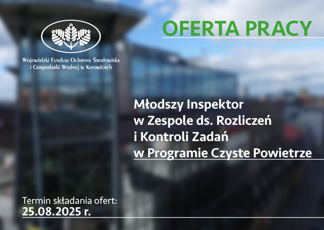 Młodszy Inspektor w Zespole ds. Rozliczeń i Kontroli Zadań w Programie Czyste Powietrze – 3 stanowiska 2025-08-11 3988 Data publikacji: 11.08.2025Ogłoszenie nr: MIRCP/08/25 Termin składania aplikacji: do 25.08.2025 roku Treść ogłoszenia11.08.2025 Listakandydatów8-09-2025 Informacja o wyniku naboru Regulamin naborukandydatów Kwestionariusz osobowy Oświadczenie kandydata