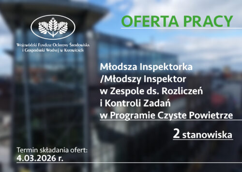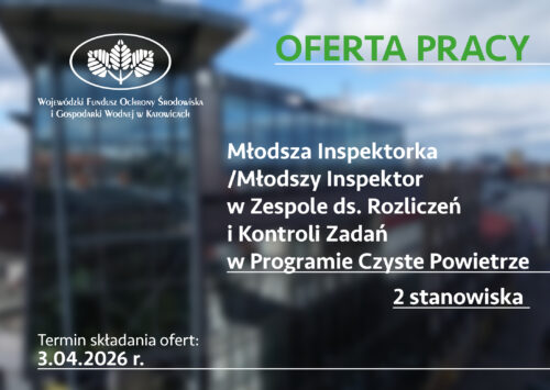Data publikacji: 13.04.2026Ogłoszenie nr: IZO/04/26 Termin składania aplikacji: do 28.04.2026 rokuMiejsce wykonywania pracy:siedziba Funduszu w Katowicach oraz obszar działania WFOŚiGW w Katowicach Treść ogłoszenia13.04.2026 Listakandydatów Informacja o wyniku naboru Regulamin naborukandydatów Kwestionariusz osobowy Oświadczenie kandydata
